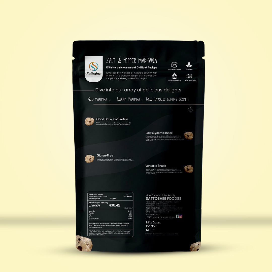Sattoshee Salt & Pepper Makhana brings you the perfect balance of taste and nutrition. Lightly roasted and seasoned with the richness of old-school recipes, each bite delivers a satisfying crunch with a touch of classic spice.